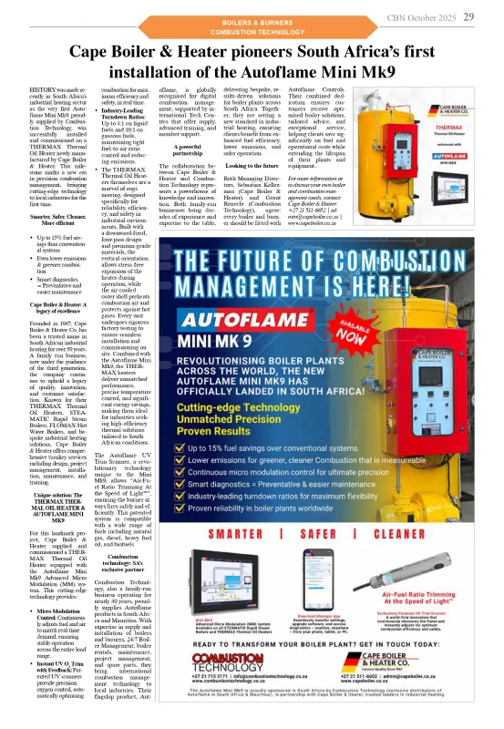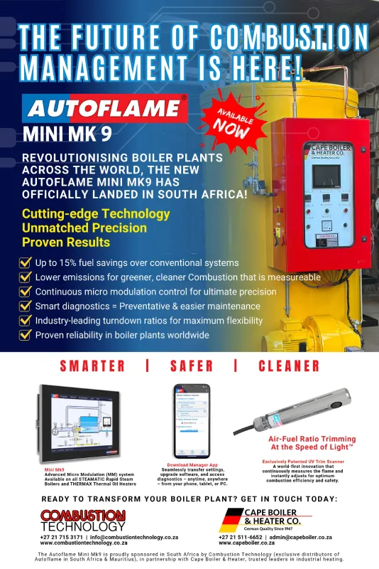 Both Managing Directors, Sebastian Kellerman (Cape Boiler & Heater) and Grant Renecle (Combustion Technology), agree: every boiler and burner should be fitted with Autoflame Controls. Their combined dedication ensures customers receive optimised boiler solutions, tailored advice, and exceptional service, helping clients save significantly on fuel and operational costs while extending the lifespan of their plants and equipment.
