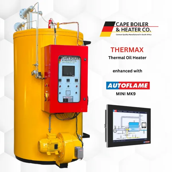 - The THERMAX Thermal Oil Heaters themselves are a marvel of engineering, designed specifically for reliability, efficiency, and safety in industrial environments. Built with a downward-fired, four-pass design and premium-grade materials, the vertical orientation allows stress-free expansion of the heater during operation, while the air-cooled outer shell preheats combustion air and protects against hot gases. Every unit undergoes rigorous factory testing to ensure seamless installation and commissioning on site. Combined with the Autoflame Mini Mk9, the THERMAX heaters deliver unmatched performance, precise temperature control, and significant energy savings, making them ideal for industries seeking high-efficiency thermal solutions tailored to South African conditions.